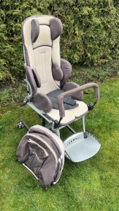 Daruji za odvoz speciální sedací jednotku Kimba Neo 2 v béžové barvě, s interiérovým i exteriérovým podvozkem a stříškou. Na fotografii je se stříbrnou barvou podvozku, tento má černou barvu podvozku, jinak je stejný. K vyzvednutí na Šumavě na Churáňovsku.