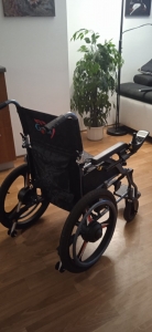Prodám odlehčený elektrický invalidní vozík GABI, hmotnost jen 25,5 kg skládací konstrukce, ovládání pomocí joysticku s funkcí Bluetooth a vestavěným rádiem FM. Dojezd 20 km a maximální rychlostí 6 km/h s regulací rychlosti. Dva motory 2x350 W, lithiová baterie 24 V a 10 Ah, nosnost 120 kg, zadní nastavitelná přídavná kolečka proti převrhnutí, mechanické brzdy. Vše plně funkční, neznatelné známky používání. Koupeno 04/2024, tedy stále v záruce, faktura k dispozici.